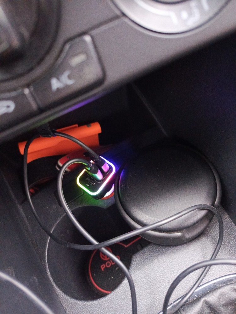 Автомобильное зарядное устройство для смартфона Arroys CR-6 выполнено в пластиковом корпусе, лицевая часть зарядки окаймлена цветовой подсветкой.