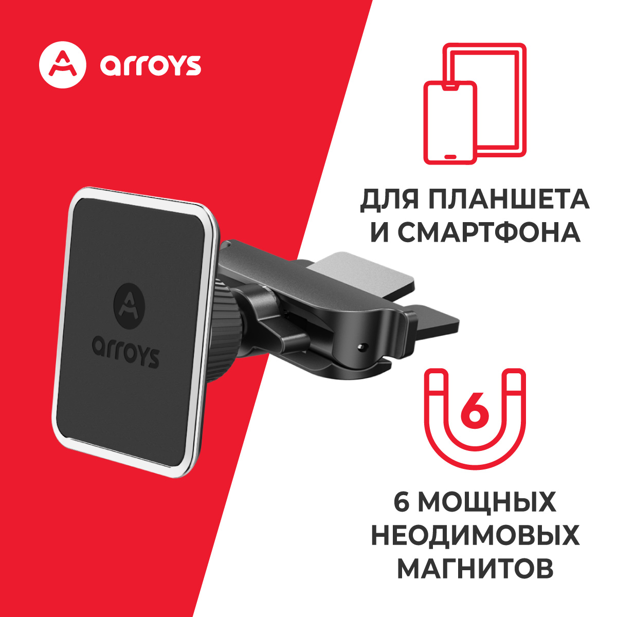 Arroys CD-SM1 состоит из трех частей: магнитной головы, зажимной гайки и основания. Шаровый шарнир, используемый для соединения магнитной части с основанием, дает возможность вращать "магнитную голову" во всех удобных направлениях, устанавливая удобный угол обзора экрана.