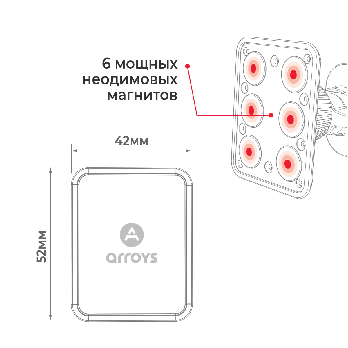 • Шесть мощных магнитов держат смартфон и планшет