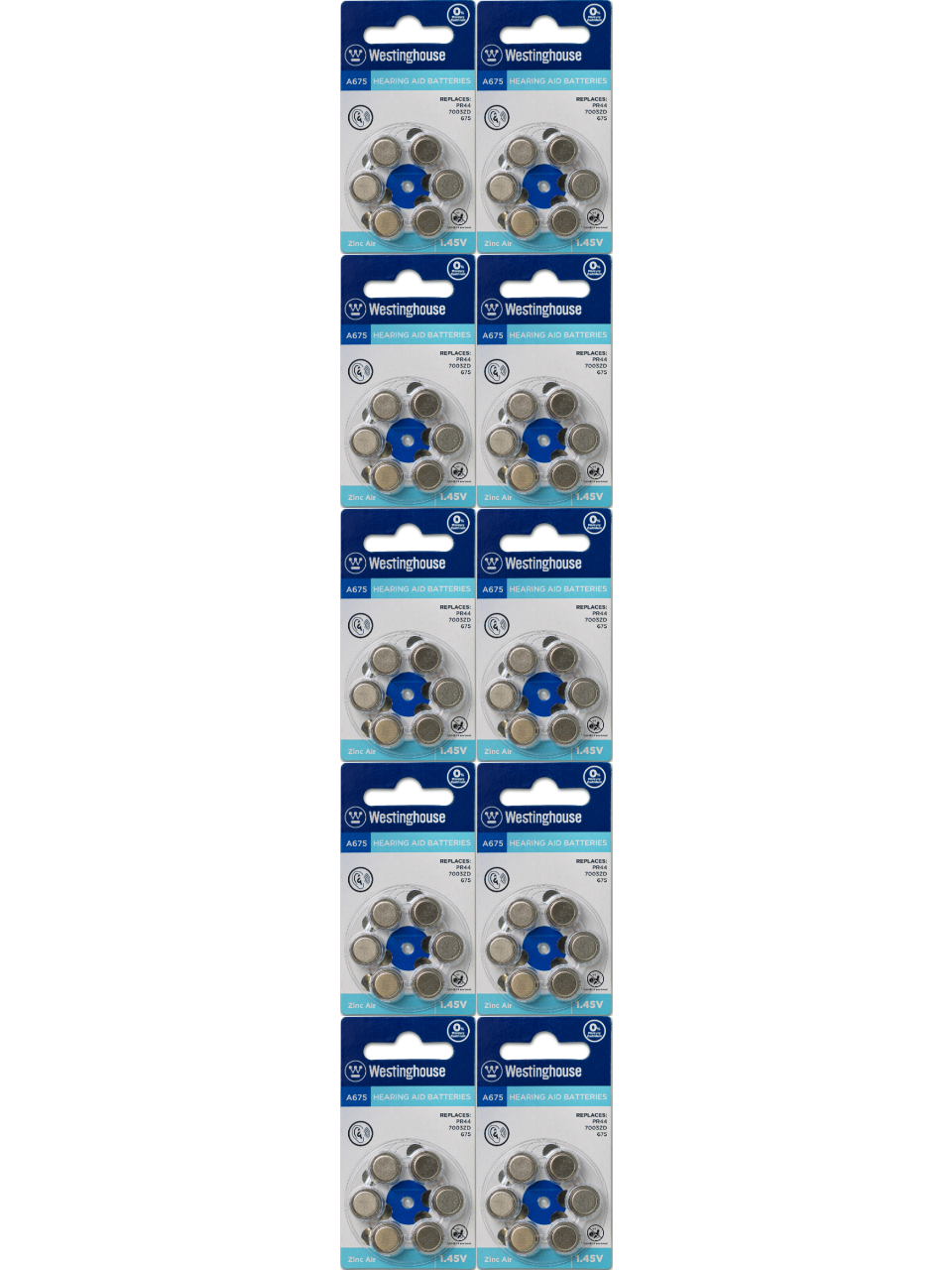 При интенсивном использовании слухового аппарата 60 штук батареек Westinghouse ZA675/PR44 должно хватить на полтора* года *Примечание. Срок службы элемента питания существенно зависит от потребляемой мощности и потоковой передачи аудио по Bluetooth